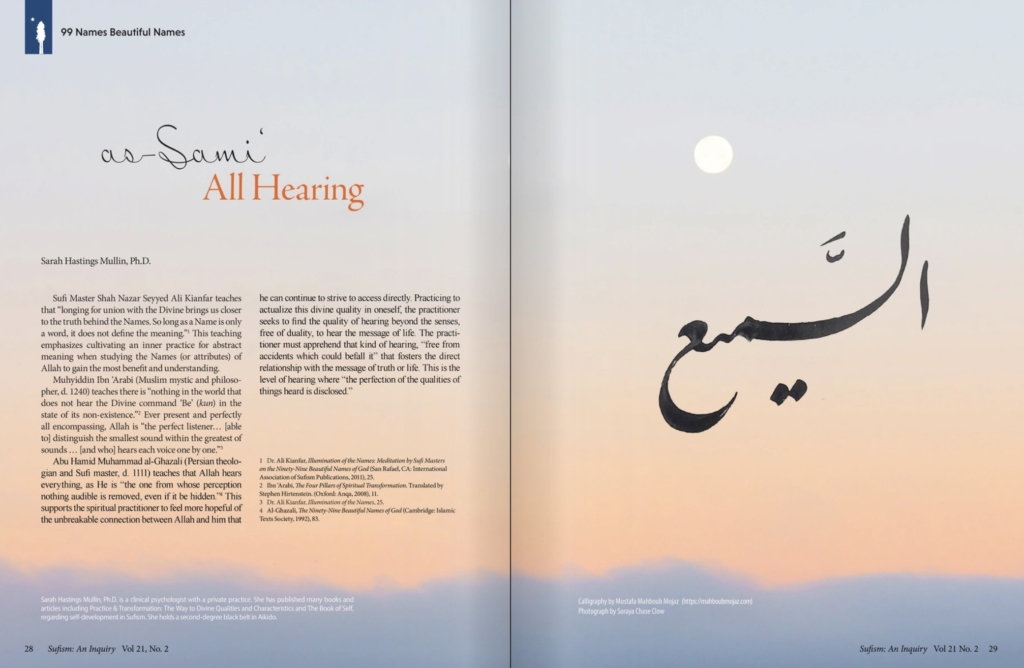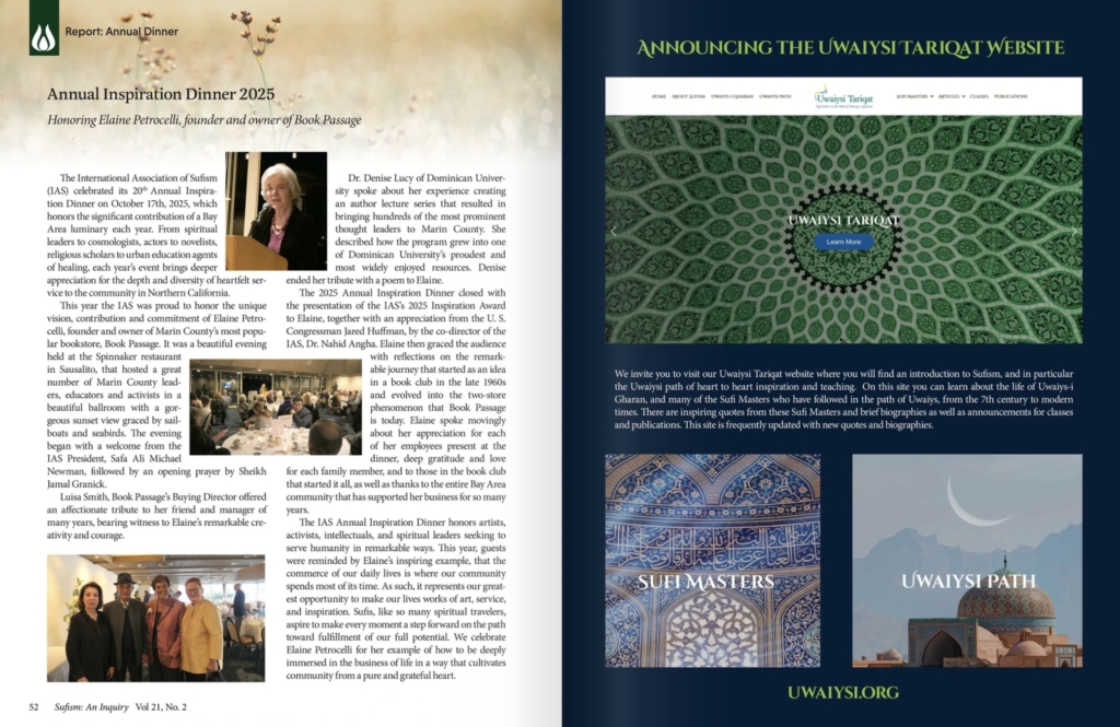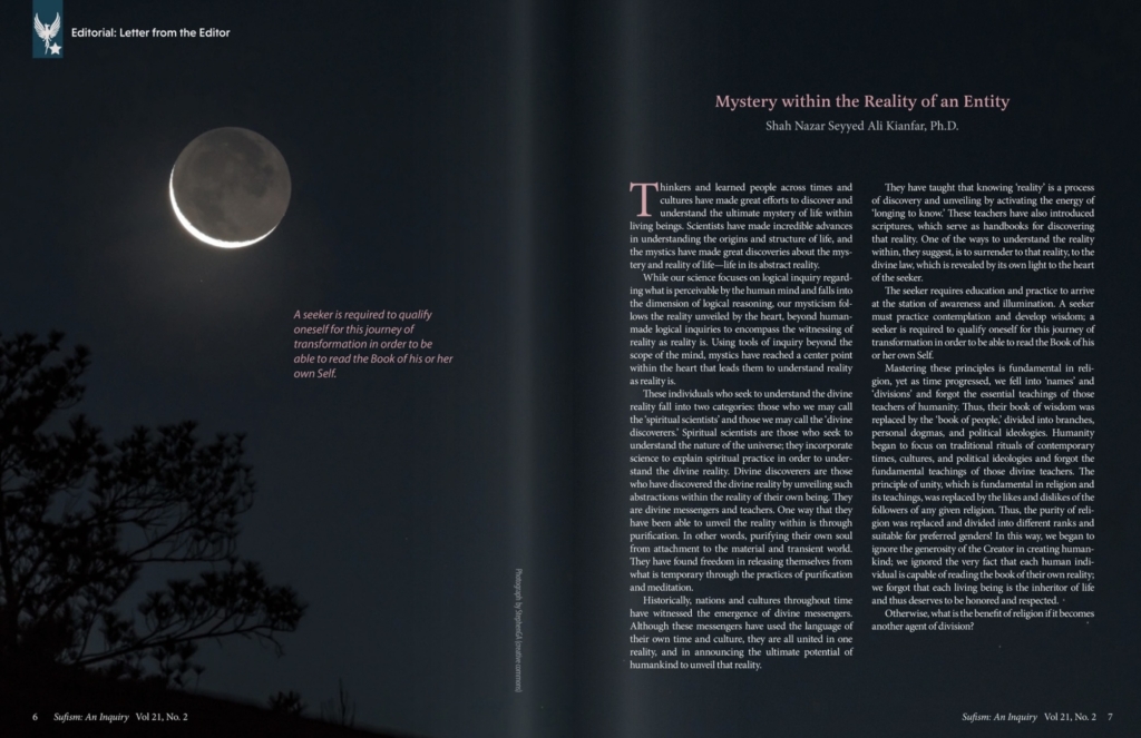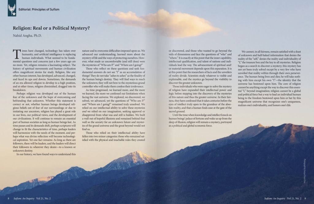 Sufism: An Inquiry, the world’s longest running journal on Sufism, was first published in 1987 with over 60 print volumes and currently available in online and print formats. Since its inception, the journal has included articles on human rights, scientific inquiries, new translations of classic works of Sufi literature and poetry, the stories of Sufi saints previously unavailable in English, and articles and essays by leading Sufi masters, poets, psychologists, and scientists on human development and the spiritual path.